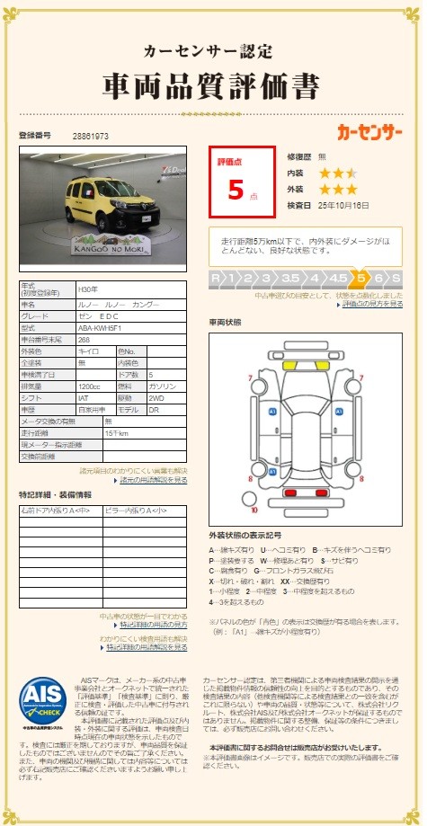 カングーの森で取り扱うカングーは第三者機関 【株式会社AIS】の車両検査を行い、車両品質評価書を全車両に付帯致します