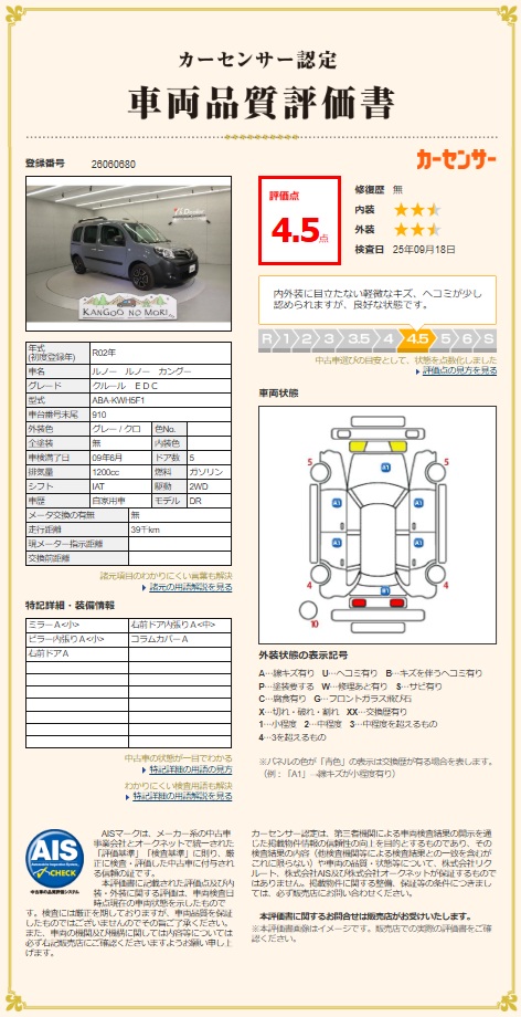 カングーの森で取り扱うカングーは第三者機関 【株式会社AIS】の車両検査を行い、車両品質評価書を全車両に付帯致します