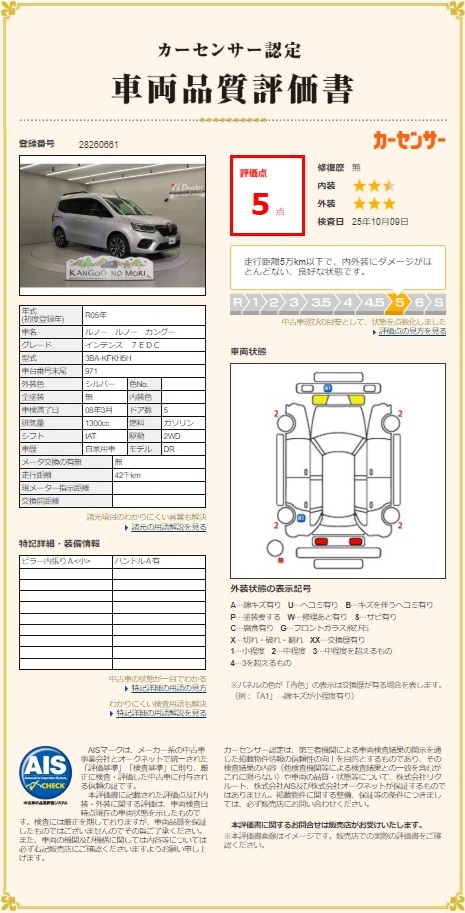 カングーの森で取り扱うカングーは第三者機関 【株式会社AIS】の車両検査を行い、車両品質評価書を全車両に付帯致します